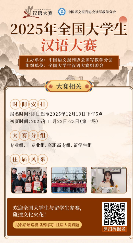为贯彻落实党的二十大精神及中共中央办公厅、国务院办公厅印发的《国家中长期教育改革和发展规划纲要》《国家通用语言文字法》等国家语言文字方针政策,推动当代大学生汉语文化素质不断进步,提高全国各高校对大学生汉语教育的重视程度,为所有热爱汉语、热爱中国文化的中外大学生搭建展示汉语水平、交流汉语学习经验的平台,中国语文报刊协会读写教学分会继续面向全国大学生举办“2025年全国大学生汉语大赛”,欢迎广大学子踊跃参加。